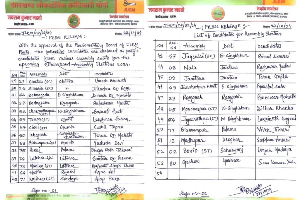 गिरिडीह: जयराम महतो की पार्टी झारखंड लोकतांत्रिक क्रांतिकारी मोर्चा (जेएलकेएम) ने मंगलवार को विधानसभा चुनाव के लिए 25 उम्मीदवारों की चौथी सूची जारी की. इस सूची में विभिन्न विधानसभा क्षेत्रों के उम्मीदवारों का नाम शामिल है.