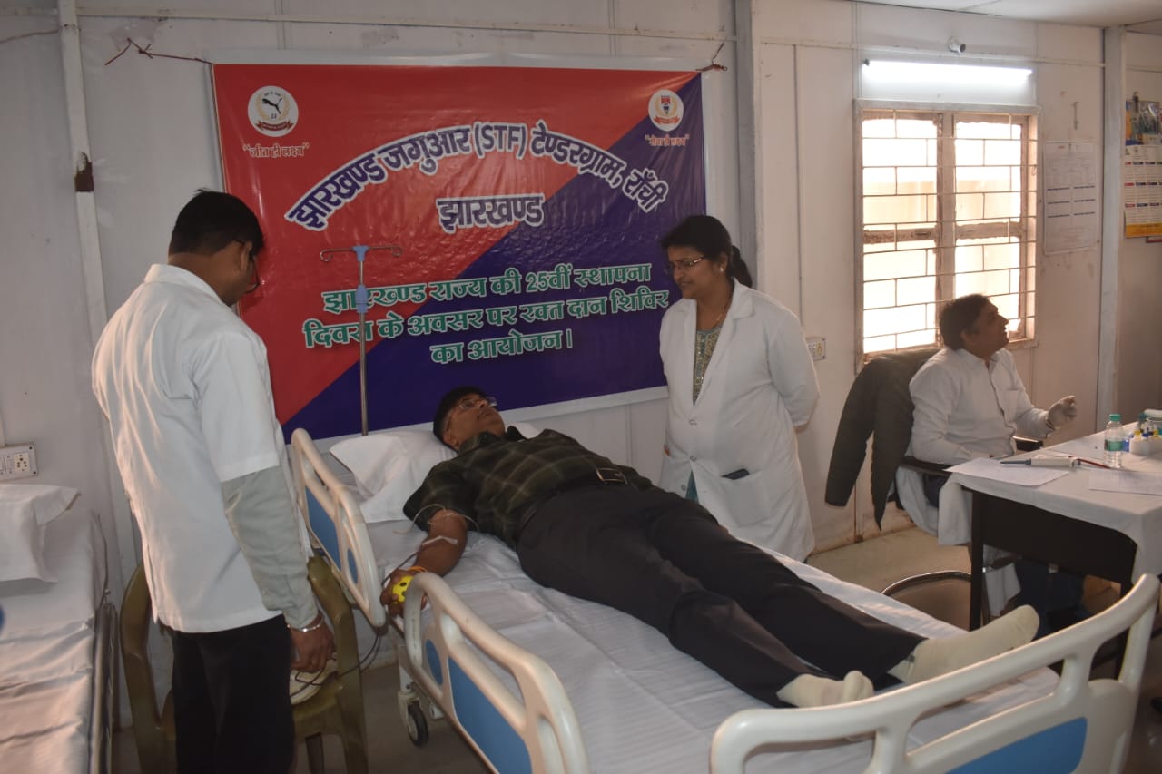 Ranchi : झारखंड राज्य के 25वें स्थापना दिवस के अवसर पर झारखंड जगुआर परिसर में भव्य रक्तदान शिविर का आयोजन किया गया। सुबह 11 बजे शुरू हुए इस शिविर में जवानों, अधिकारियों और उनके परिवार ने उत्साहपूर्वक भाग लिया।