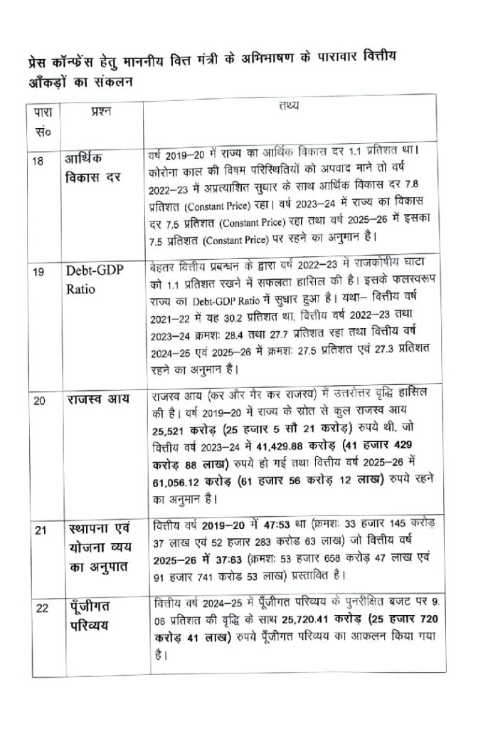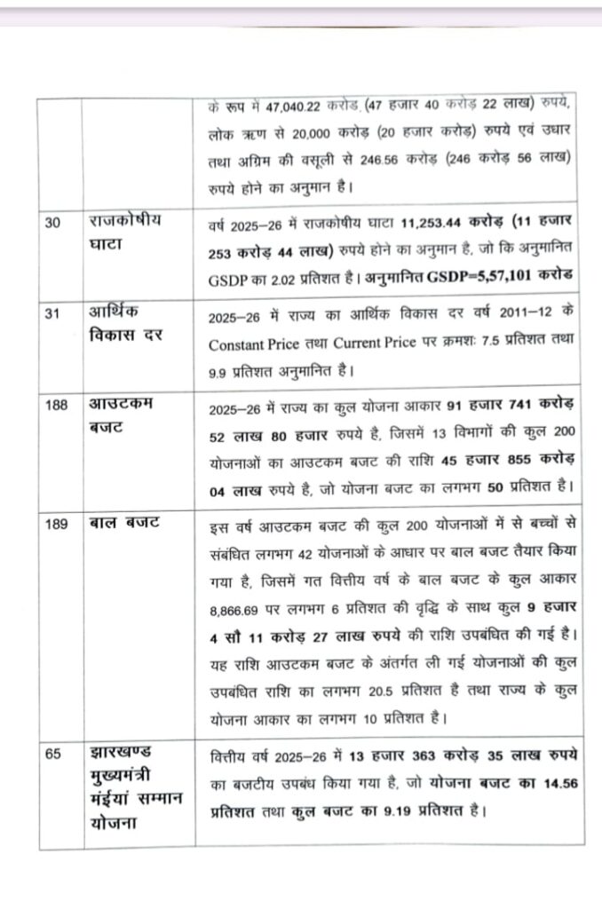Ranchi : झारखंड विधानसभा में आज यानी सोमवार को राज्य का बजट पेश किया गया। वित्त मंत्री राधा कृष्ण किशोर ने बजट पेश किया। वित्त मंत्री ने 1 लाख 45 हजार 400 करोड़ का बजट पेश किया। यह बजट वित्तीय वर्ष 2024-25 में 1,28,900 करोड़ था। बजट पेश करने से पहले उन्होंने राज्यपाल संतोष गंगवार और सीएम हेमंत सोरेन को बजट की कॉपी सौंपी। सत्र की कार्यवाही सुबह 11:05 बजे शुरू हुई, जिसके बाद प्रश्नकाल चला। इस दौरान विधायक सरयू राय ने केंद्र सरकार पर झारखंड के 1.36 लाख करोड़ रुपये बकाया होने का मुद्दा उठाया। इस पर प्रभारी मंत्री योगेंद्र प्रसाद ने जवाब देते हुए बताया कि बकाया राशि की गणना के लिए एक समिति का गठन किया गया है। वहीं, आज के बजट में मंईयां सम्मान योजना के लिये 13 हजार 363 करोड़ 35 लाख रुपये का फंड और बच्चों से जुड़े करीब 42 योजनाओं के लिये 9411 करोड़ रुपये आवंटित किये गये हैं। इस दरम्यान वित्तमंत्री राधा कृष्ण किशोर ने जो पारावार वित्तीय आंकरों का संकलन पेश किया… देखिये