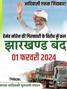 रांची: ईडी की टीम द्वारा हेमंत सोरेन की गिरफ्तारी के विरोध में गुरुवार को झारखंड बंद का ऐलान किया गया है. इसकी पुष्टि केंद्रीय सरना समिति केंद्रीय अध्यक्ष अजय तिर्की ने की. अजय तिर्की ने कहा कि बंदी में अखिल भारतीय आदिवासी विकास परिषद, आदिवासी सेना, राजी पड़ा प्रार्थना सभा भारत का समर्थन है. बंदी के बाद से राज्य में बवाल होने की भी संभावना जताई जा रही है. ऐसे में सुरक्षा को लेकर झारखंड पुलिस क्या कदम उठाती है वो देखना है. फिलहाल राजधानी में संवेदनशील जगहों पर अतिरिक्त पुलिस बल की तैनाती कर दी गयी है. जिला पुलिस के अलावा आईआरबी, रैफ, जैप समेत सुरक्षाबलों की टुकड़ी तैनात है.