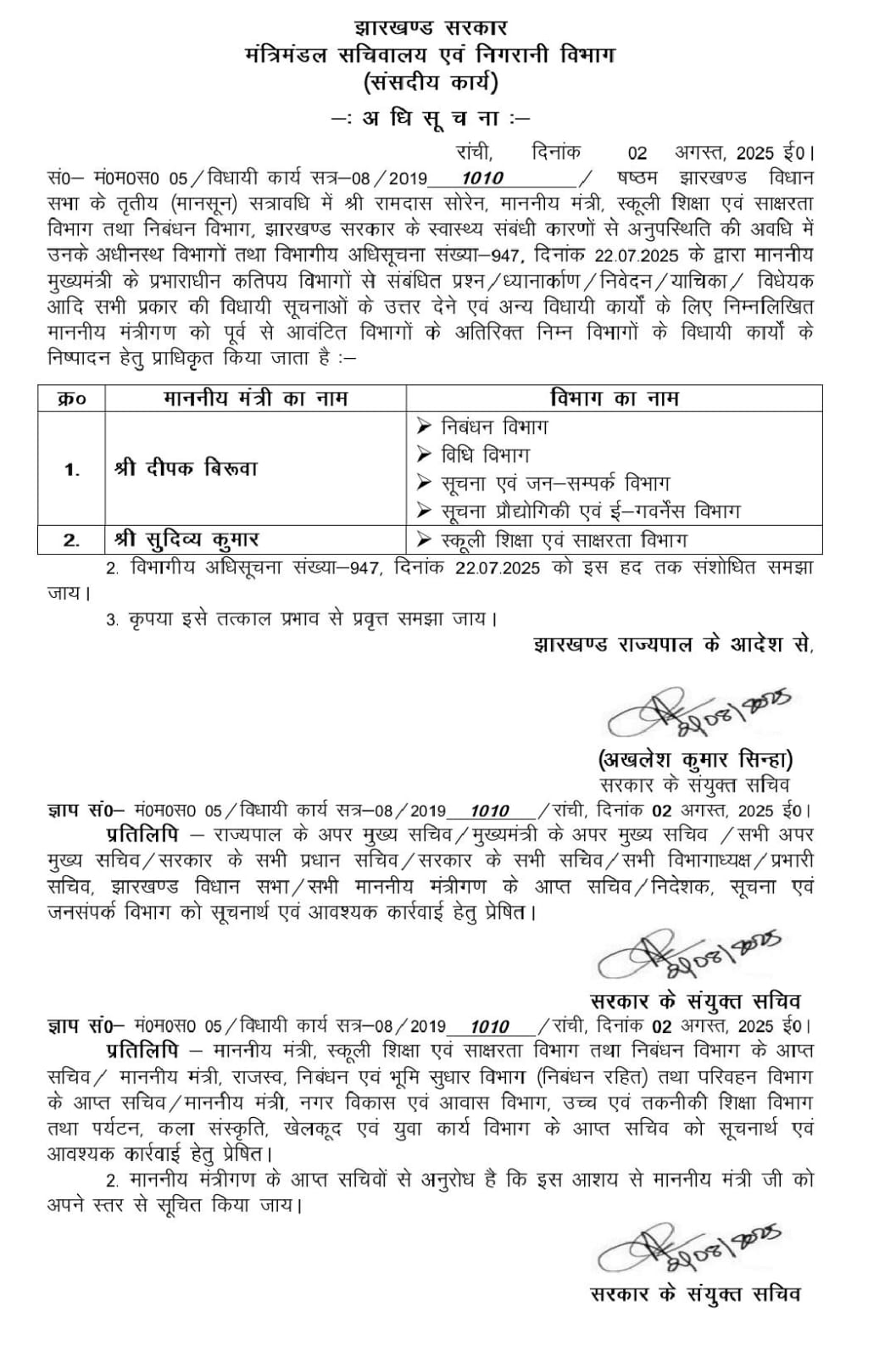 सुदिव्य कुमार को उच्च शिक्षा के साथ-साथ स्कूली शिक्षा और साक्षरता विभाग की जिम्मेदारी सौंपी गई है। वहीं, दीपक बिरुआ को रामदास सोरेन के मंत्रालयों के अलावा निबंधन विभाग, विधि विभाग, सूचना एवं जनसंपर्क विभाग, और सूचना प्रौद्योगिकी एवं ई-गवर्नेंस विभाग का प्रभार दिया गया है। दोनों मंत्रियों को रामदास सोरेन के कार्यों को संभालने का निर्देश दिया गया है।