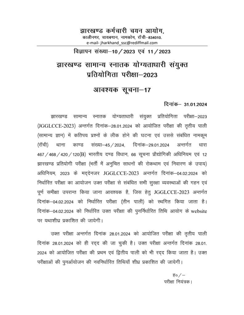 रांची : JSSC-CGL प्रश्नपत्र लीक मामले में झारखंड कर्मचारी चयन आयोग ने तीनों पालियों में ली गयी परीक्षा को रद्द कर दिया है. इस संबंध में आयोग की ओर से सूचना भी जारी कर दी गयी है. बता दें कि 28 जनवरी को JSSC-CGL की हुई परीक्षा के प्रश्नपत्र लीक होने की गंभीरता को देखते हुए आयोग ने तृतीय पाली की परीक्षा को रद्द किया था. आयोग के परीक्षा नियंत्रक ने इस संबंध में कहा कि जल्द ही परीक्षाओं का फिर से आयोजन किया जायेगा. नये सिरे से परीक्षा की तिथि चार फरवरी को जारी की जायेगी. इस संबंध में नामकुम थाना में प्राथमिकी भी दर्ज की गयी. आयोग पूरे मामले की सुरक्षा दृष्टि से समीक्षा कर रहा है, इसके बाद परीक्षा की तिथि जारी करेगा.