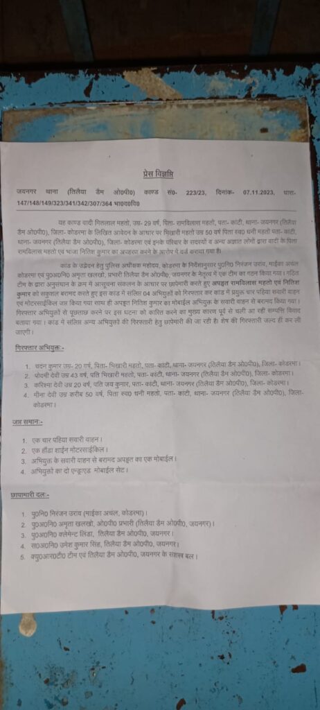 कोडरमा : तिलैया डैम ओपी क्षेत्र में नाना और नाती की अपहरण के सनसनीखेज मामले में कोडरमा पुलिस ने 7 नवंबर को एफआईआर दर्ज होने के महज 24 घंटे के भीतर घटना को अंजाम देने वाले 4 अपराधियों को गिरफ्तार कर लिया. जबकि फरार चल रहे अन्य तीन अपराधियों को पकड़ने के लिए लगातार छापेमारी कर रही है.