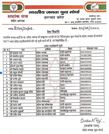 रांची : भारतीय जनता पार्टी के प्रदेश अध्यक्ष बाबूलाल मरांडी के निर्देश पर युवा मोर्चा के प्रदेश अध्यक्ष शशांक राज ने आज प्रदेश पदाधिकारियों की नई सूची जारी की है. जिसके तहत शशांक राज प्रदेश अध्यक्ष बनाए गए है. वहीं प्रदेश उपाध्यक्ष सत्यदेव मुंडा, अजातशत्रु, अमन यादव, पूजा सिंह, विकास महतो, राहुल चौधरी को बनाया गया है. प्रदेश महामंत्री की जिम्मेवारी रूपेश सिंह को दी गई है. वहीं मनीष दुबे भी प्रदेश महामंत्री बनाए गए हैं. इसके अलावा प्रदेश मंत्री का जिम्मा पवन पासवान, अमित साहू, राजीव रंजन, संजीव कुमार गुड्डू पटेल, अमित अग्रवाल, विश्वजीत पाठक को दिया गया है. निवास को प्रदेश कोषाध्यक्ष नियुक्त किया गया है. वहीं पवन आर्या को प्रदेश सह कोषाध्यक्ष बनाया गया है. संजय महतो प्रदेश कार्यालय मंत्री के प्रभार में रहेंगे. वहीं प्रदीप मुखर्जी और रणधीर दास को प्रदेश सह कार्यालय मंत्री बनाया गया है.