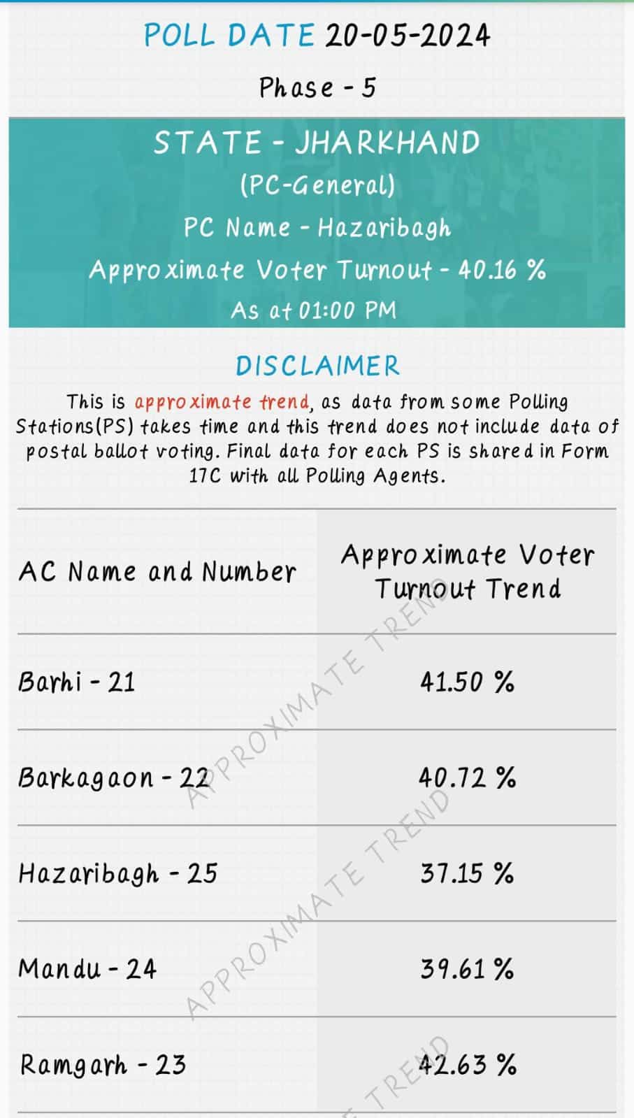रांची : निर्वाचन आयोग ने दोपहर 1 बजे तक के मतदान की अपडेट जारी की है. रामगढ़ में 1 बजे तक 42.63 फीसदी मतदान हुऐ है. कोडरमा लोकसभा सीट पर 1 बजे तक 42.73 फीसदी वोटिंग हुई है. वहीं, गांडेय विधानसभा सीट पर 40.38 फीसदी लोग अपने मताधिकार का इस्तेमाल कर चुके हैं. कोडरमा लोकसभा क्षेत्र के किस विधानसभा क्षेत्र में अब तक कितना मतदान हुआ है, यहां देखें.