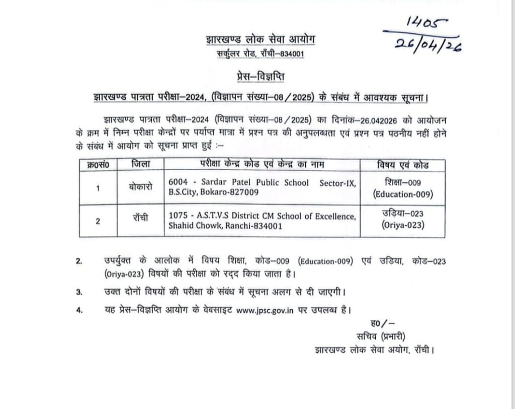 झारखंड लोक सेवा आयोग (JPSC) ने दोनों केंद्रों की परीक्षा रद्द होने की आधिकारिक पुष्टि कर दी है। आयोग की ओर से कहा गया है कि प्रभावित अभ्यर्थियों के लिए नई परीक्षा तिथि जल्द ही आधिकारिक वेबसाइट पर जारी की जाएगी। साथ ही पूरे मामले की जांच कर दोषियों के खिलाफ कार्रवाई की बात भी कही गई है।