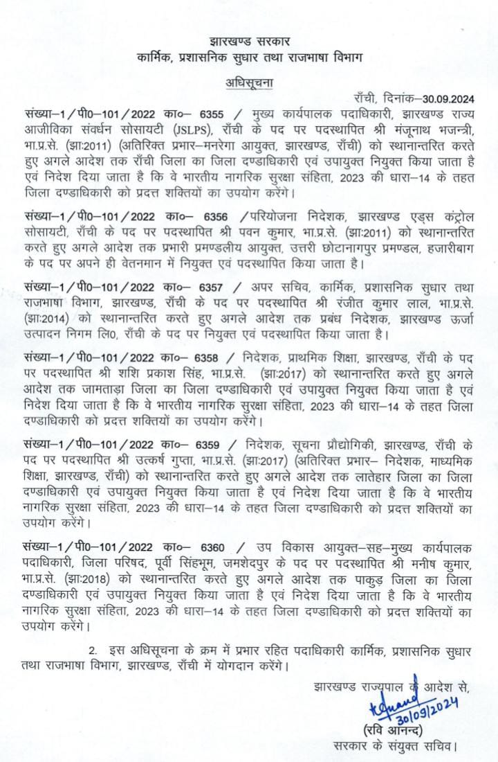 रांची : झारखंड सरकार ने 6 आईएएस अधिकारियों का तबादला कर दिया है. जिसकी अधिसूचना जारी कर दी गई है. मुख्य कार्यपालक पदाधिकारी, झारखण्ड राज्य आजीविका संवर्धन सोसायटी रांची के पद पर पदस्थापित मंजूनाथ भजन्त्री अतिरिक्त प्रभार-मनरेगा आयुक्त, झारखण्ड, राँची) को स्थानान्तरित करते हुए अगले आदेश तक रांची जिला का जिला दण्डाधिकारी एवं उपायुक्त नियुक्त किया जाता है. निदेश दिया जाता है कि वे भारतीय नागरिक सुरक्षा संहिता, 2023 की धारा-14 के तहत जिला दण्डाधिकारी को प्रदत्त शक्तियों का उपयोग करेंगे. परियोजना निदेशक झारखण्ड एड्स कंट्रोल सोसायटी, राँची के पद पर पदस्थापित पवन कुमार को स्थानान्तरित करते हुए अगले आदेश तक प्रभारी प्रमण्डलीय आयुक्त उत्तरी छोटानागपुर प्रमण्डल हजारीबाग के पद पर अपने ही वेतनमान में नियुक्त एवं पदस्थापित किया जाता है.