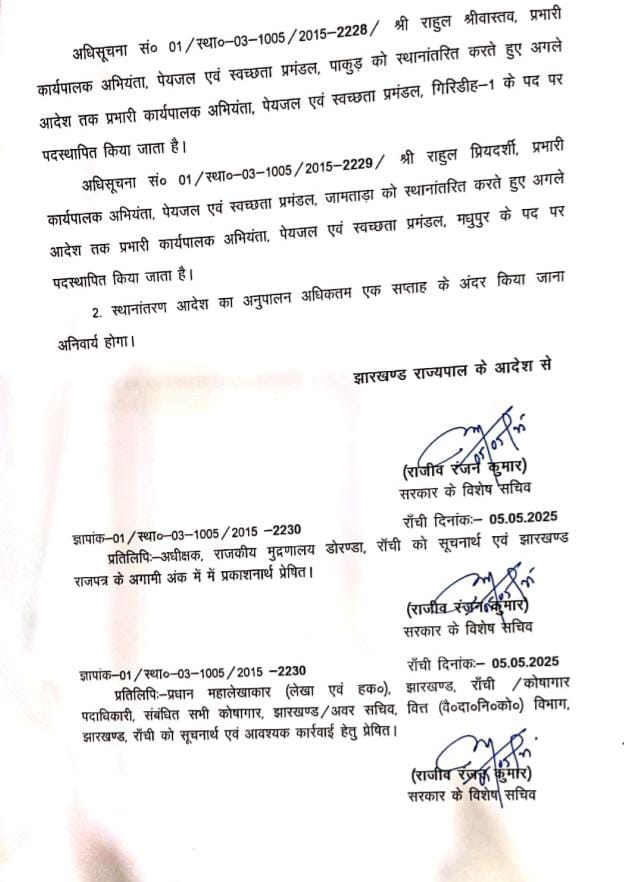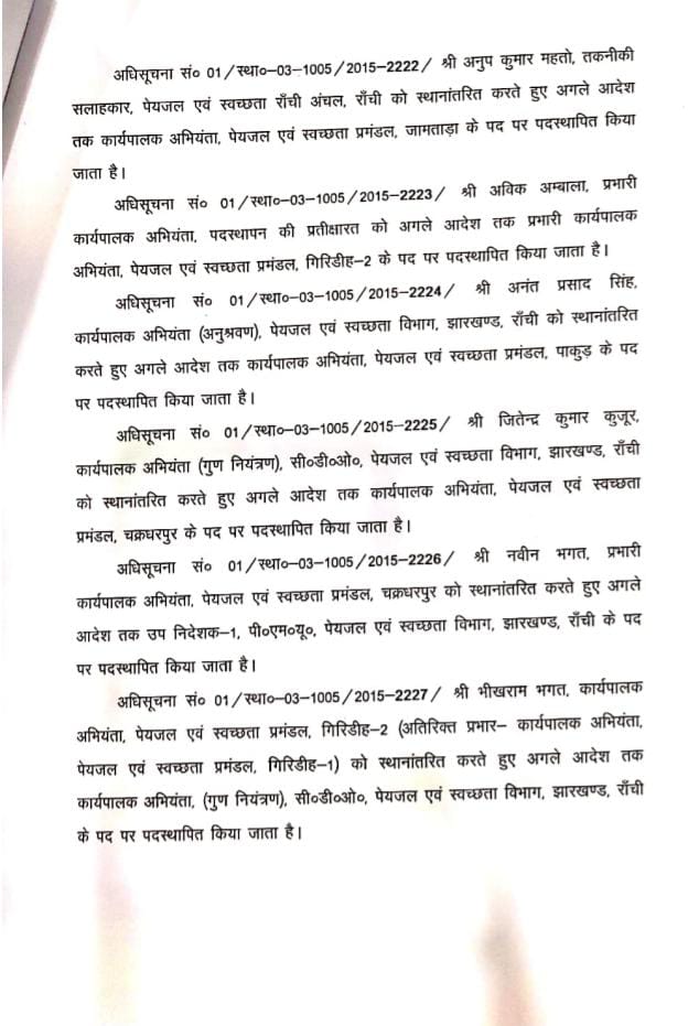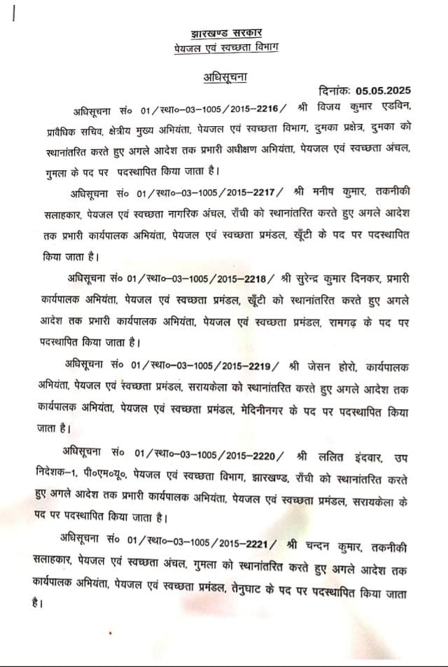 Ranchi : झारखंड के पेयजल एवं स्वच्छता विभाग के कई अधिकारियों को इधर से उधर किया गया है। संबंधित अधिसूचना जारी कर दी गई है। किस अधिकारी को कहां भेजा गया… देखें पूरी लिस्ट