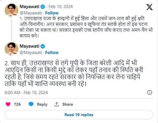 लखनऊ : बसपा (बहुजन समाज पार्टी) प्रमुख मायावती ने उत्तराखंड के हल्द्वानी में हुई हिंसा पर चिंता व्यक्त करते हुए इसकी उच्च स्तरीय जांच कराए जाने की मांग की है. मायावती ने सोशल मीडिया मंच ‘एक्स’ पर एक बयान में कहा, ‘‘उत्तराखंड राज्य के हल्द्वानी में हुई हिंसा और उसमें जान-माल की क्षति अति-चिंतनीय है.