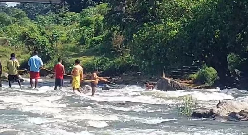 रामगढ़ : देश के प्रसिद्ध सिद्धपीठ मां छिन्नमस्तिका मंदिर स्थित भैरवी नदी के तेज बहाव में बिहार के दो युवक आ गए. दामोदर भैरवी संगम स्थल के पास दोनों युवक बचते बचाते एक गड्ढे में किसी तरह चट्टान को पकड़ा और खड़े होकर जान बचाने की गुहार लगाने लगे. यह देख स्थानीय और मंदिर न्यास समिति के पुजारी ने कड़ी मशक्कत के बाद दोनों युवकों को सकुशल नदी की तेजधार से बाहर निकाला.