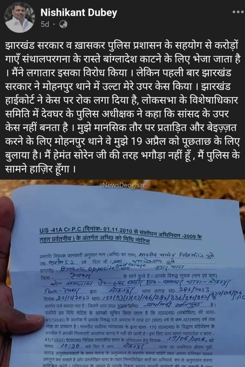 बता दें कि पुलिस ने गोड्डा लोकसभा के भाजपा प्रत्याशी निशिकांत दुबे को नोटिस देकर पूछताछ के लिए बुलाई थी. ज्ञात हो कि निशिकांत दुबे मोहनपुर थाना में दर्ज कांड संख्या 281/2023 में प्राथमिक अभियुक्त हैं. दुबे पर भादवि की धारा 151(बी) (1) (सी), 166, 290, 336, 341, 342, 427, 504 समेत अन्य धाराओं में मामला दर्ज है. जारी नोटिस के अनुसार अनुसंधान में सहयोग करने के लिए 19 अप्रैल के दिन 10.30 बजे मोहनपुर थाना में बुलाया गया था. इस मामले के सूचक ने निशिकांत दुबे पर उग्र होकर लप्पड़ थप्पड़ करने और धमकी देने का आरोप लगाया है.