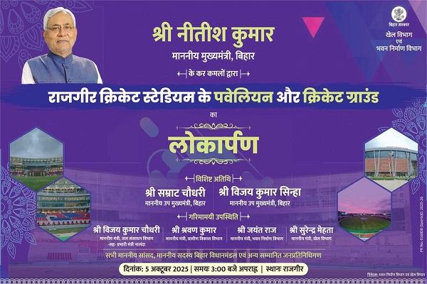 Nalanda :   मुख्यमंत्री नीतीश कुमार आज शाम 3 बजे राजगीर के नए क्रिकेट स्टेडियम के पवेलियन और ग्राउंड का उद्घाटन करेंगे। इस खास मौके पर उपमुख्यमंत्री सम्राट चौधरी, मंत्री विजय कुमार सिन्हा, विजय कुमार चौधरी, श्रवण कुमार, जयंत राज कुशवाहा समेत कई विधायक और अधिकारी भी मौजूद रहेंगे।
