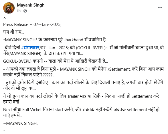 Ranchi : “MAYANK SINGH के कारनामे पूरे Jharkhand में प्रचलित हैं… बीते दिनों #मंगलवार/07 Jan 2025 को (GOKUL-BVEPL) में जो गोलीबारी घटना हुआ था, वो मेरे (MAYANK SINGH) के द्वारा कराया गया था… GOKUL-BVEPL कंपनी वाला को मेरा ये आख़िरी चेतावनी है… आपको क्या लगता है मुझे MAYANK SINGH को मैनेज /Settlement करे बिना आप काम करके नहीं निकल पाएंगे???…