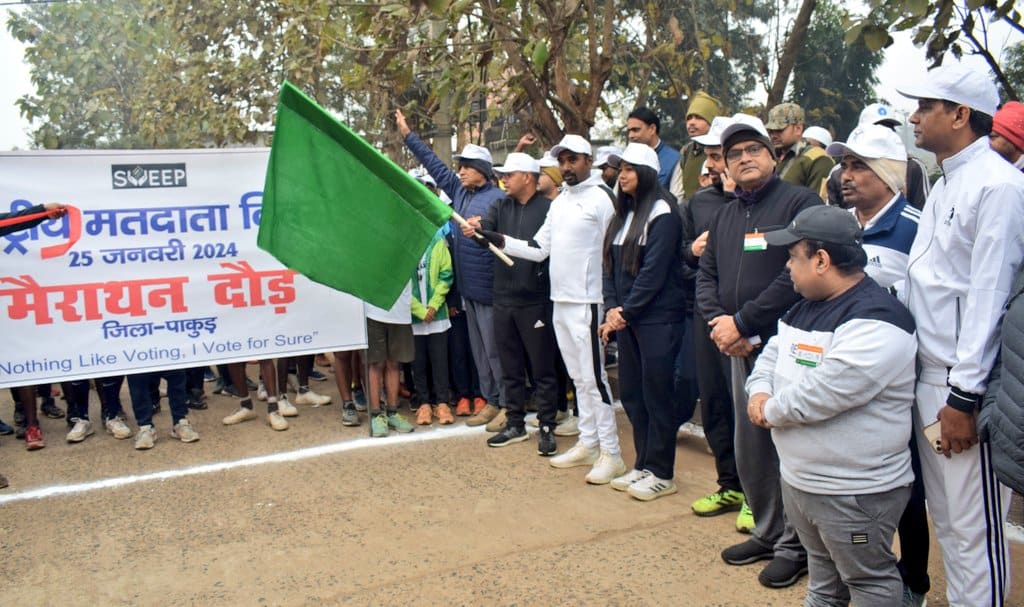 पाकुड़ : 75वें गणतंत्र दिवस के पूर्व जिला प्रशासन द्वारा मैराथन दौड़ का आयोजन किया गया. मैराथन दौड़ की शुरूआत गुरुवार को सिद्धो कान्हू मुर्मू पार्क स्थित वीआईपी रोड से हुई. दौड़ को उपायुक्त मृत्युंजय कुमार बरणवाल व पुलिस अधीक्षक प्रभात कुमार ने हरी झंडी दिखाकर रवाना किया. मैराथन में काफी संख्या में युवाओं ने हिस्सा लिया. मैराथन दौड़ वीआईपी रोड से शुरू होकर सोनाजोड़ी और वहां से वीआईपी रोड आकर समाप्त हुई.