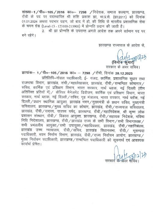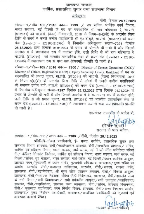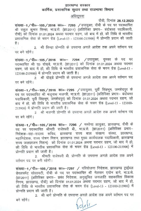 रांची : झारखंड में 8 आईएएस अधिकारियों को प्रमोशन मिला है. इस संबंध में कार्मिक, प्रशासनिक सुधार तथा राजभाषा विभाग ने अधिसूचना जारी कर दी है. रांची के डीसी राहुल सिन्हा को बंदोबस्ती का अतिरिक्त प्रभार एवं दुमका डीसी ए. दोड्डे को सिलेक्शन ग्रेड लेवल 13 में प्रमोशन दिया गया है.