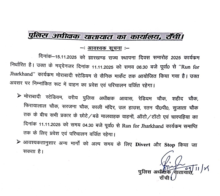 Ranchi : झारखंड राज्य स्थापना दिवस समारोह 2025 के मद्देनजर 11 नवंबर को राजधानी रांची में ट्रैफिक व्यवस्था में बदलाव किया गया है। ट्रैफिक एसपी कार्यालय की ओर से जारी सूचना के अनुसार, “Run for Jharkhand” कार्यक्रम का आयोजन 11 नवंबर की सुबह 6:30 बजे मोराबादी स्टेडियम से सैनिक मार्केट तक किया जाएगा।