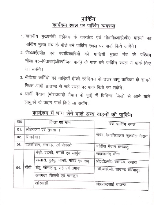 - अन्य जिलों से आने वाले लाभुकों के वाहन आर्मी ग्राउंड (मोरहाबादी मैदान के पूर्व) और तय स्थलों पर पार्क किए जाएंगे।