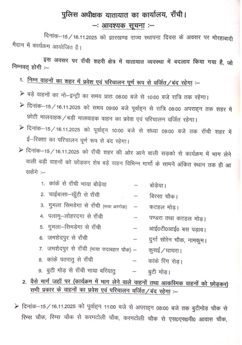 Ranchi : झारखंड राज्य स्थापना दिवस (15-16 नवंबर 2025) के अवसर पर मोरहाबादी मैदान में होने वाले मुख्य कार्यक्रम के मद्देनज़र ट्रैफिक एसपी, रांची ने शहर की यातायात व्यवस्था में अस्थायी बदलाव किया है। यह व्यवस्था सुरक्षा और सुचारू आवागमन को ध्यान में रखते हुए की गई है।