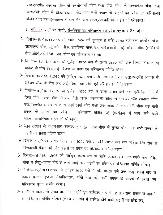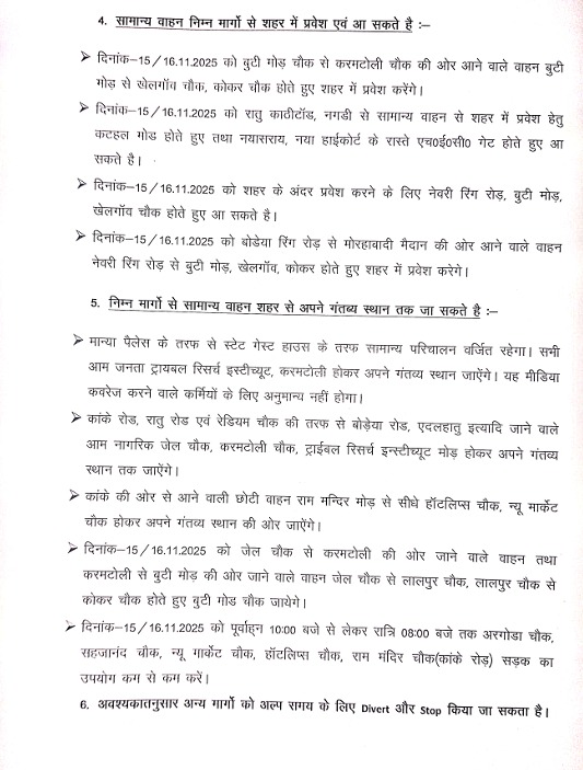 राँची ट्रैफिक पुलिस ने नागरिकों से अपील की है कि 15 और 16 नवंबर को अनावश्यक यात्रा से बचें, वैकल्पिक मार्गों का उपयोग करें और पुलिस के निर्देशों का पालन करें। आवश्यकतानुसार कुछ मार्गों को अस्थायी रूप से डायवर्ट या रोका भी जा सकता है।