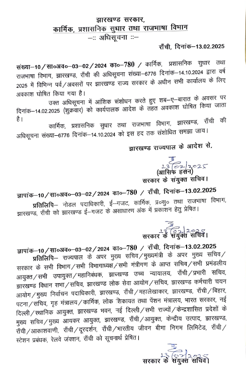 जारी आदेश में कहा गया है कि 14 अक्टूबर 2024 में जारी अधिसूचना के तहत वर्ष 2025 में विभिन्न पर्वों और अवसरों पर झारखंड राज्य सरकार के अधीन सभी कार्यालयों के लिए अवकाश घोषित किया गया है। इस अधिसूचना में आंशिक संशोधन करते हुए शब-ए-बारात के अवसर पर 14 फरवरी 2025 (शुक्रवार) को कार्यपालक आदेश के तहत अवकाश घोषित किया जाता है।