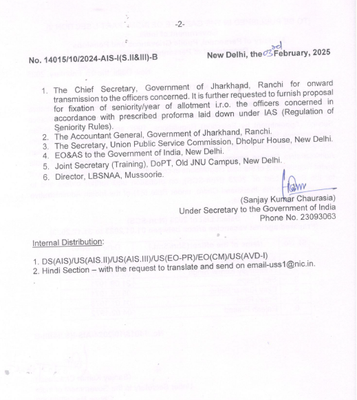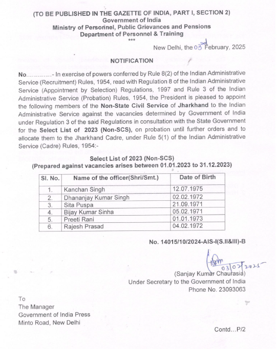 Ranchi : झारखंड कैडर के नॉन स्टेट सिविल सेवा के छह अफसरों को IAS यानी भारतीय प्रशासनिक सेना में प्रमोशन दिया गया है। संबंधित अधिसूचना केंद्रीय कार्मिक मंत्रालय भारत सरकार की ओर से जारी कर दी गयी है। साल 2003 की वैकेंसी को लेकर इन अधिकारियों को प्रमोशन दिया गया है।