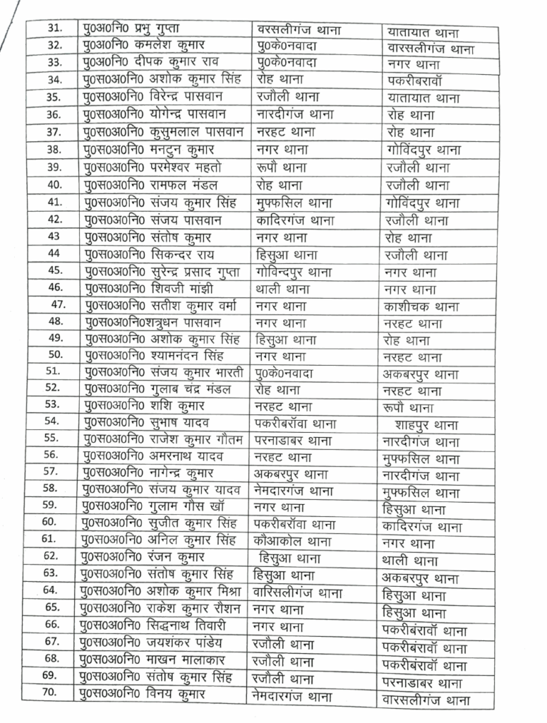 Nawada : बिहार के नवादा में 78 पुलिस अधिकारियों को इधर से उधर किया गया है। लंबे समय से एक ही थाने में तैनात सब इंस्पेक्टर (SI) और असिस्टेंट सब इंस्पेक्टर (ASI) रैंक के अधिकारियों का तबादला किया गया है। संबंधित सूचना नवादा पुलिस कप्तान अभिनव धीमान के आदेश से जारी कर दी गयी है। एसपी अभिनव धीमान ने कहा कि एक ही स्थान पर लंबे समय तक तैनाती से कई बार कार्यशैली में शिथिलता आ जाती है, जिससे कानून व्यवस्था पर प्रतिकूल असर पड़ता है। ऐसे में यह तबादला जरूरी था। ट्रांसफर किये गये सभी पुलिस अधिकारियों को तत्काल योगदान देने का निर्देश दिया गया है। कौन से अधिकारी का कहां हुआ तबादला… देखें लिस्ट