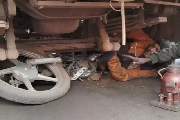 ग्रामीणों ने मदद की स्टील प्लांट कर्मचारी हाइवा के नीचे फंसा