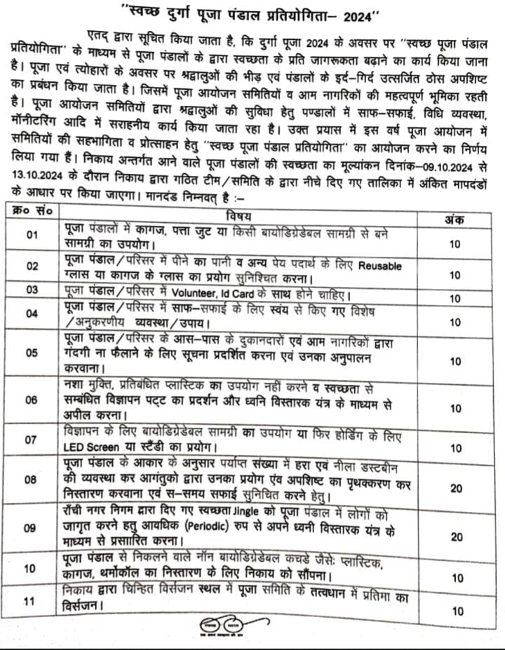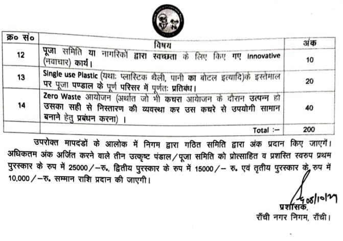9 से 13 अक्टूबर जागरूकता ठोस अपशिष्ट प्रबंधन दुर्गा पूजा पूजा आयोजन समितियां प्रतियोगिता 200 मार्क्स मापदंड मूल्यांकन मॉनीटरिंग रांची नगर निगम विधि व्यवस्था श्रद्वालुओं की भीड़ साफ-सफाई स्वच्छ पूजा पंडाल प्रतियोगिता स्वच्छता