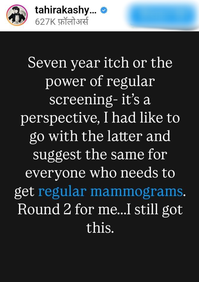 उन्होंने एक पोस्ट शेयर किया है जिसमें लिखा था, ‘सात साल की खुजली या नियमित जांच की शक्ति- यह एक दृष्टिकोण है, मैं बाद वाले के साथ जाना चाहती थी और उन सभी के लिए यही सुझाव देना चाहती थी जिन्हें नियमित मैमोग्राम करवाने की आवश्यकता है। मेरे लिए दूसरा दौर…मुझे फिर हो गया है।’ ताहिरा ने पोस्ट के साथ एक लंबा कैप्शन दिया, ‘जब जीवन आपको नींबू देता है, तो नींबू पानी बनाइए। कई जीवन बहुत उदार हो जाता है और यही नीबू जिंदगी आप पर फिर से फेंकती है तो आप अपने पसंदीदा काला खट्टा में इसे शांति से निचोड़ लेते हैं और नेक इरादे के साथ इसे पीते हैं। क्योंकि एक तो यह एक बेहतर पेय है और दूसरा आप जानते हैं कि आप एक बार फिर अपना सर्वश्रेष्ठ देंगे।’ इसी नोट के अंत में उन्होंने लिखा, ‘नियमित जांच-मैमोग्राम इसे कहने से नहीं कतराते ब्रेस्ट कैंसर एक और बार चलो चलते हैं। विडंबना यह है कि आज विश्व स्वास्थ्य दिवस है। आइए हम अपनी देखभाल करने की क्षमता में जो कुछ भी कर सकते हैं, करें। पूरी तरह से आभार।’