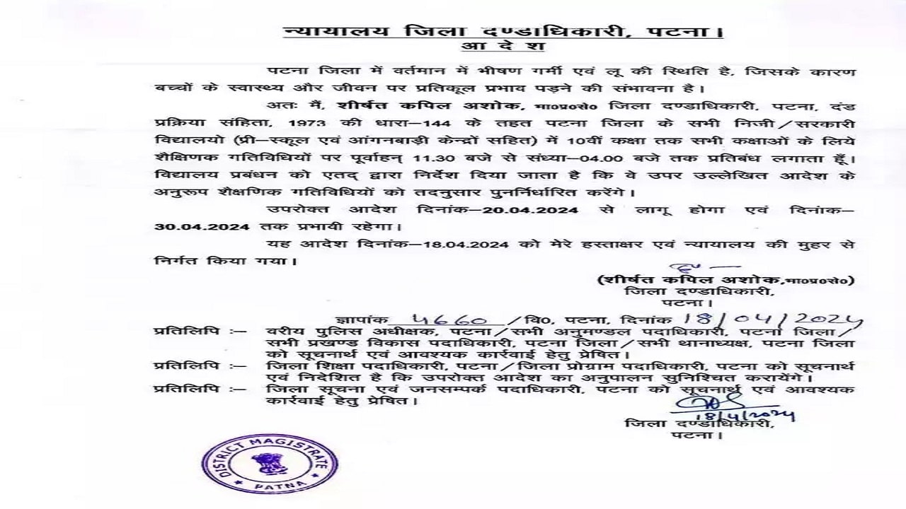 जिले के सभी स्कूलों को बंद करने का आदेश जारी किया है. इस आदेश में लिखा है कि, ”पटना जिला में वर्तमान में भीषण गर्मी एवं लू की स्थिति है, जिसके कारण बच्चों के स्वास्थ्य और जीवन पर प्रतिकूल प्रभाव पड़ने की संभावना है. अतः में शीर्षत कपिल अशोक, IAS, जिला दंडाधिकारी, पटना, दंड प्रक्रिया संहिता की धारा 144 के तहत पटना जिले के सभी निजी/सरकारी विद्यालयों (प्री स्कूल एवं आंगनबाड़ी केंद्रों सहित) में 10वीं कक्षा तक के लिए सभी कक्षाओं के लिए शैक्षणिक गतिविधियों पर पूर्वाह्न 11 बजे से संध्या 4 बजे तक प्रतिबंध लगाता हूं.” इस आदेश के साथ-साथ डीएम ने अभिभावकों से भी सावधानी बरतने की अपील की है. उन्होंने सुनिश्चित किया है कि इस समय की बड़ी गर्मी और लू से बच्चों को सुरक्षित रखने के लिए यह कदम उचित है.