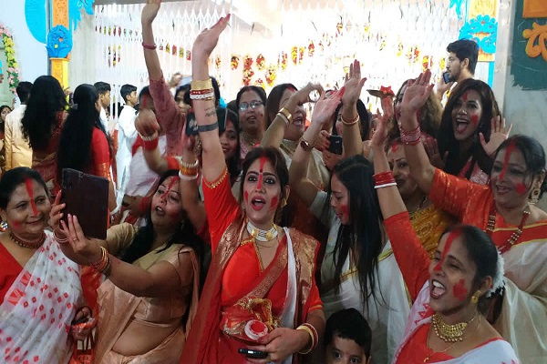 माना जाता है कि यह रस्म विवाहित महिलाओं के लिए सौभाग्य लेकर आती है और उनके परिवार में खुशहाली बनी रहती है। पूरे आयोजन के दौरान दुर्गाबाड़ी परिसर मां की जयकारों और सिंदूर से सराबोर नजर आता है।