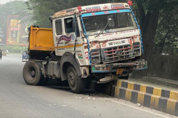 Trailer climbs over divider in Jamshedpur जमशेदपुर में ट्रेलर डिवाइडर पर चढ़ा