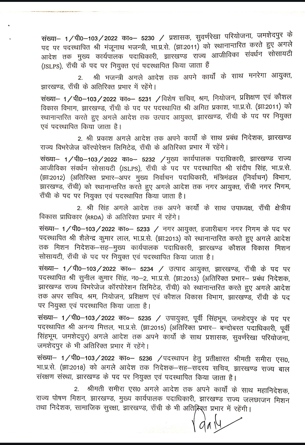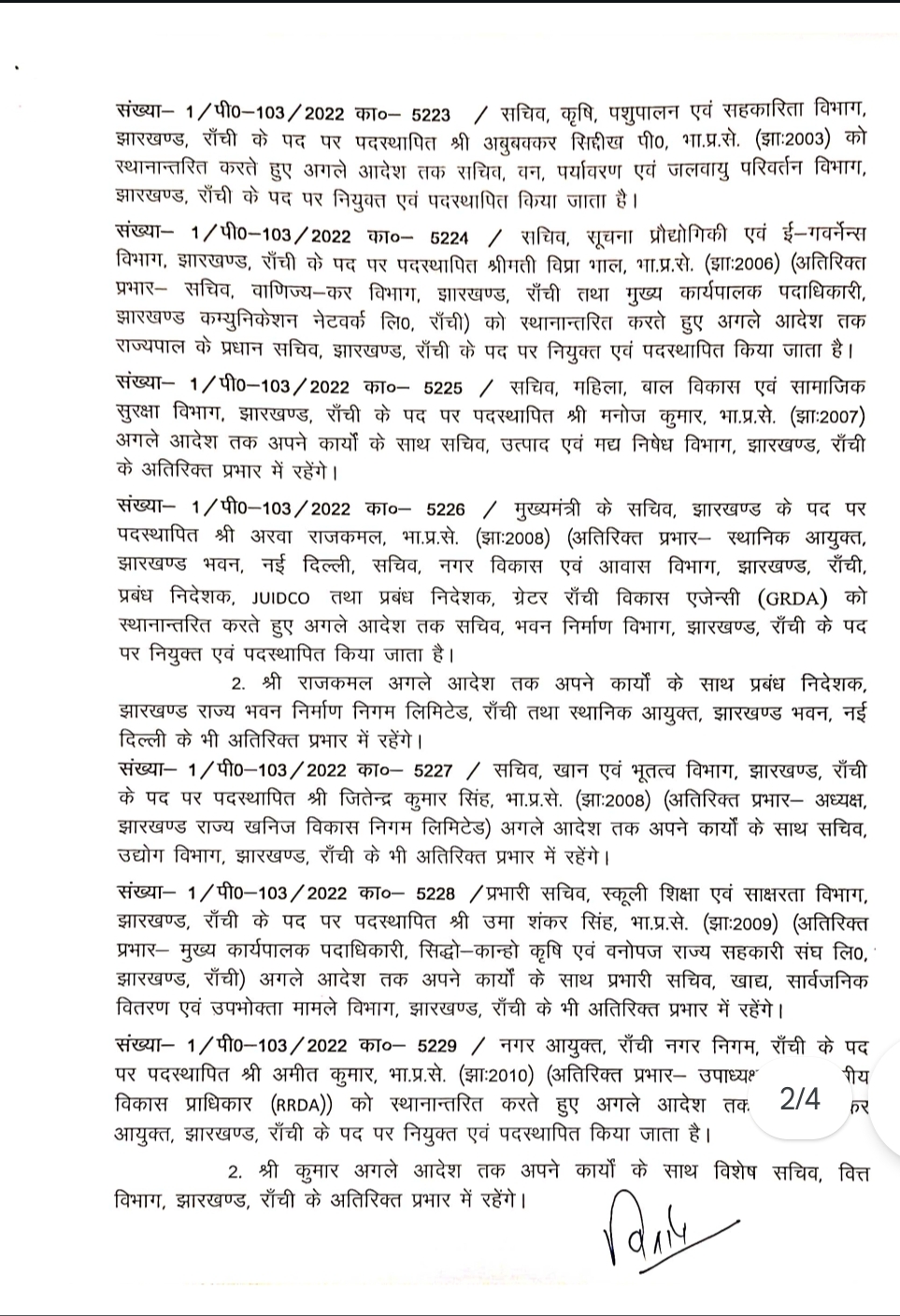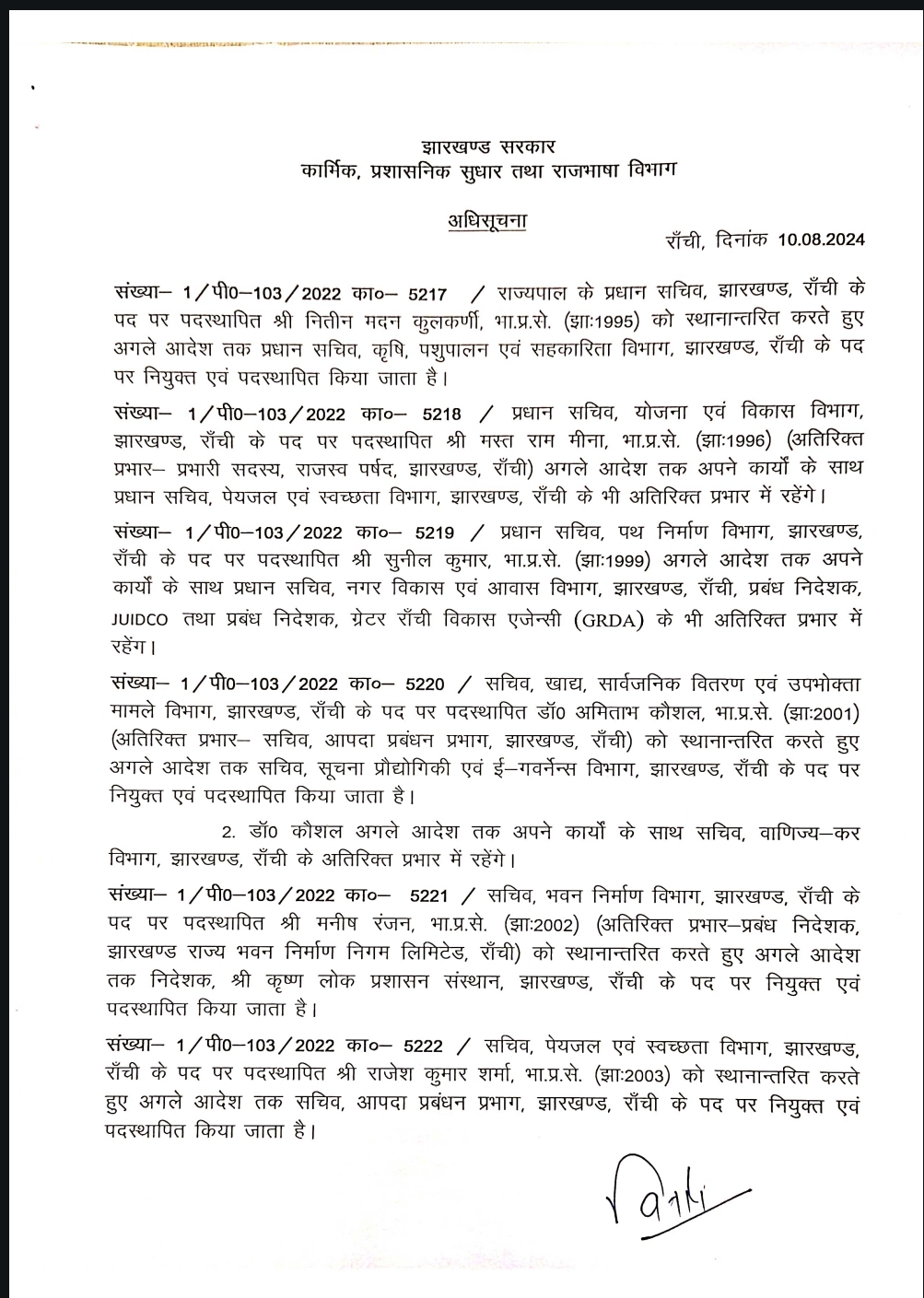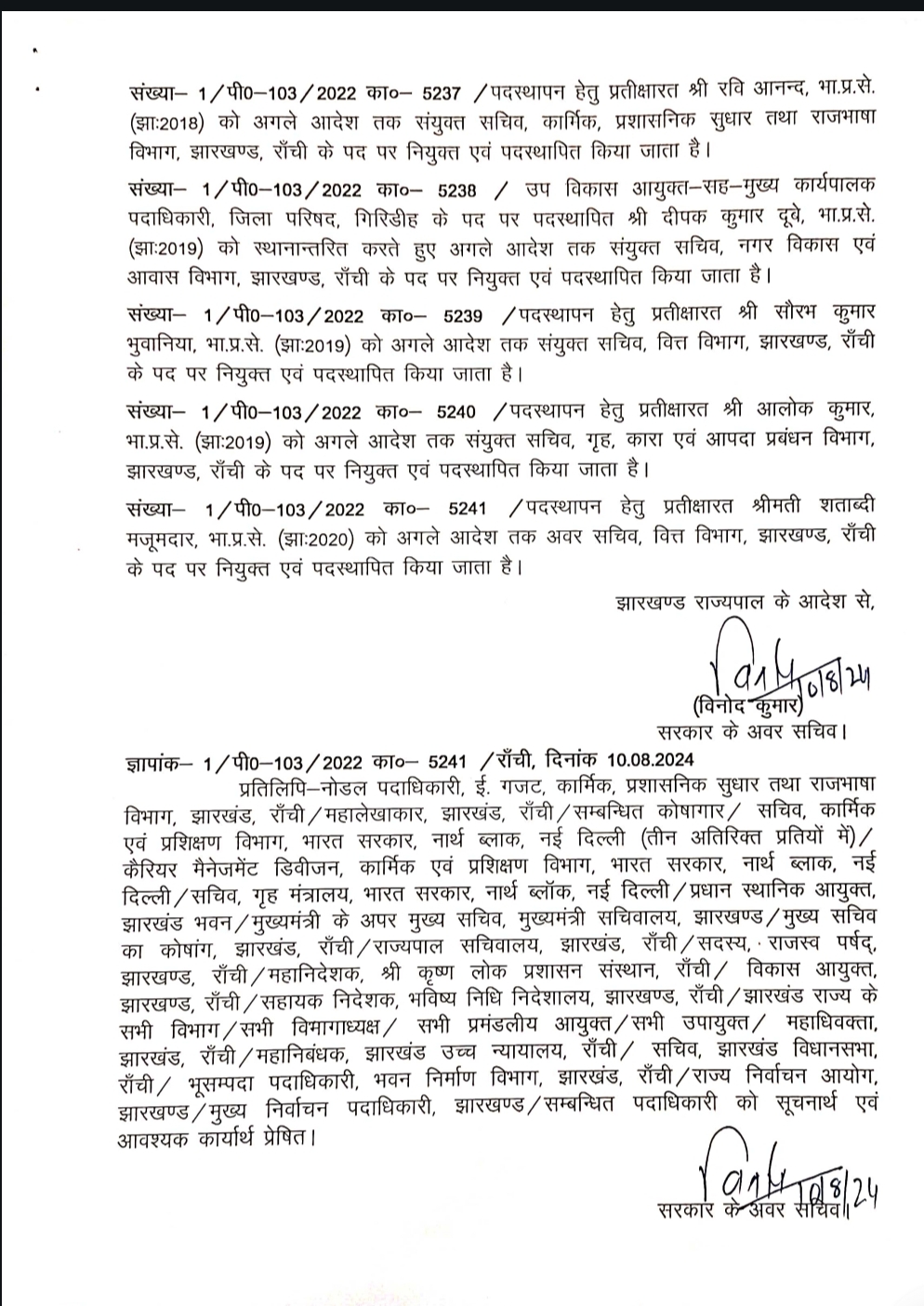 IAS अधिकारी अधिसूचना झारखंड सरकार तबादला प्रशासनिक फेरबदल. बड़े पैमाने रांची शनिवार सूची