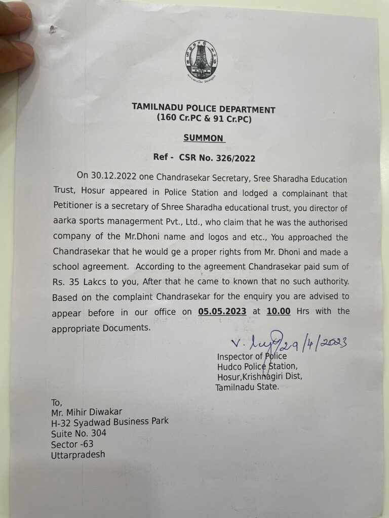 धोनी की तरफ से इस समझौते को बनाए रखने के लिए कई प्रयास किए गए. हालांकि, अरका स्पोर्ट्स फ्रेंचाइजी की तरफ से लगातार समझौते में निर्दिष्ट नियमों और शर्तों की अवहेलना की गई. इस वजह से धोनी ने 15 अगस्त, 2021 को अरका स्पोर्ट्स को दिया गया अधिकार पत्र रद्द कर दिया और कई कानूनी नोटिस भेजे, लेकिन कोई फायदा नहीं हुआ. विधि एसोसिएट्स के माध्यम से एमएस धोनी का प्रतिनिधित्व करने वाले दयानंद सिंह ने दावा किया है कि अरका स्पोर्ट्स ने उन्हें धोखा दिया, जिसके कारण धोनी को 15 करोड़ रुपये से अधिक का नुकसान हुआ.