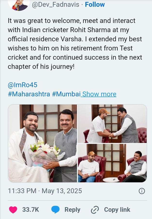 CM देवेंद्र फडणवीस ने सोशल मीडिया पर रोहित शर्मा के साथ तस्वीरें साझा करते हुए लिखा कि इस साल भारतीय क्रिकेटर रोहित शर्मा का मेरे आधिकारिक आवास पर स्वागत करना, उनसे मिलना और बातचीत करना मेरे लिए बेहद खुशी की बात थी। मैंने उन्हें टेस्ट क्रिकेट से संन्यास लेने और उनके अगले सफर के लिए शुभकामनाएं दीं।